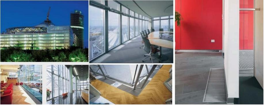 在绝大部分情况下,地板空调对流器都可以完美适应玻璃幕墙结构特点,不仅可以帮助室内环境控制系统实现最佳室内舒适度、节能性用性和空气质量的卫生性标准,而且设备本身具有非常好的室内装饰性外观效果。