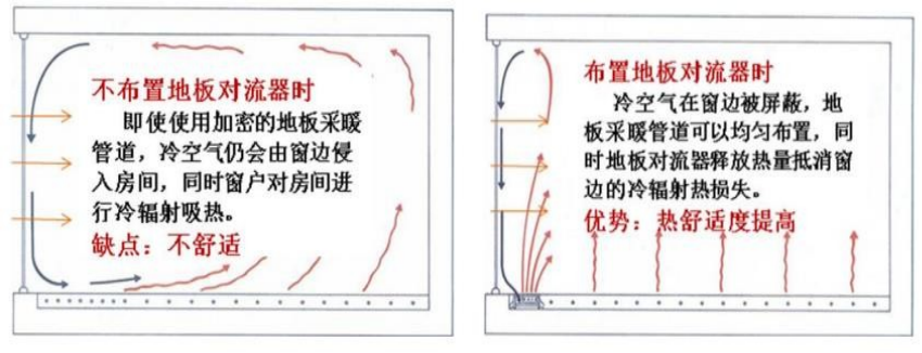 冬季, 地板对流空调系统沿幕墙 向上吹出加热的空气,阻断了冷气流的产生,或将其屏蔽在 窗户附近,以达到保护室内热环境的目的。夏季,地板对流空调系统向上吹出冷风,阻断玻璃附近的 热气流的产生,避免其沿天花向室内干扰流动。